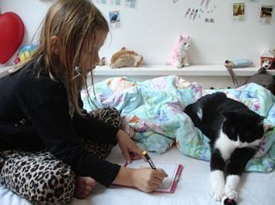 Hier noch ein kleiner Bericht von Lea (7 J.), den sie unter dem Titel "Was sie darf" verfaßt hat (ich schreibe das ohne Korrekturen ab): "Si daf in 4 wochen raus, sie daf im bet schlafen, sie ißt feuchtfuta und trokenfuta, am liebsten mag si lekalis. Wir sind so glücklich."